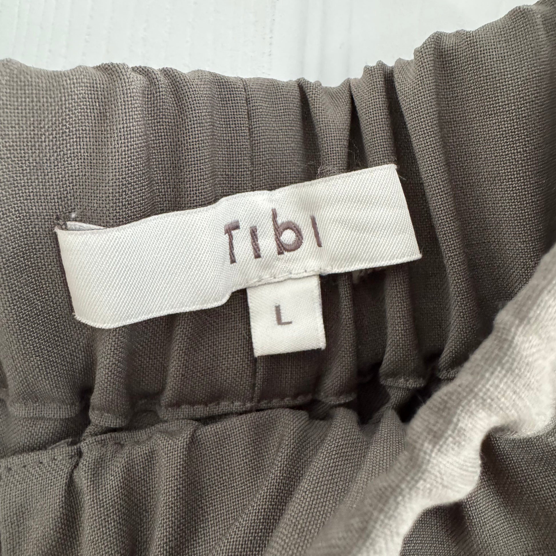 Tibi Tropical Wool Pull On Wilt Jogger in Dark Stone, size Large. Fits true to size. One of the brand's best-selling suiting fabrications, tropical wool, done in the signature jogger pant silhouette. This ideal mix of dressed up and casual could not be more versatile - pair with literally any shoe - out for dinner, to hit the grocery store or head out to the office. This pant is a mid-rise with a full bottom. It sits just below the waist and above the high hip. 31 inches waistband, unstretched, stretches comfortably to 44 inches to get on and off. 14.5 inch rise. 24 inch inseam. 37 inches total length. 53% Polyester 43% Wool 4% Elastane. In excellent condition. Originally over $600CAD, and selling here for $185CAD!