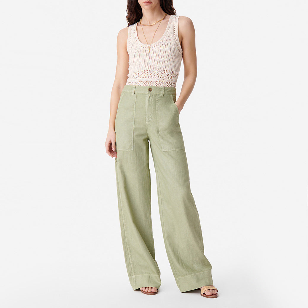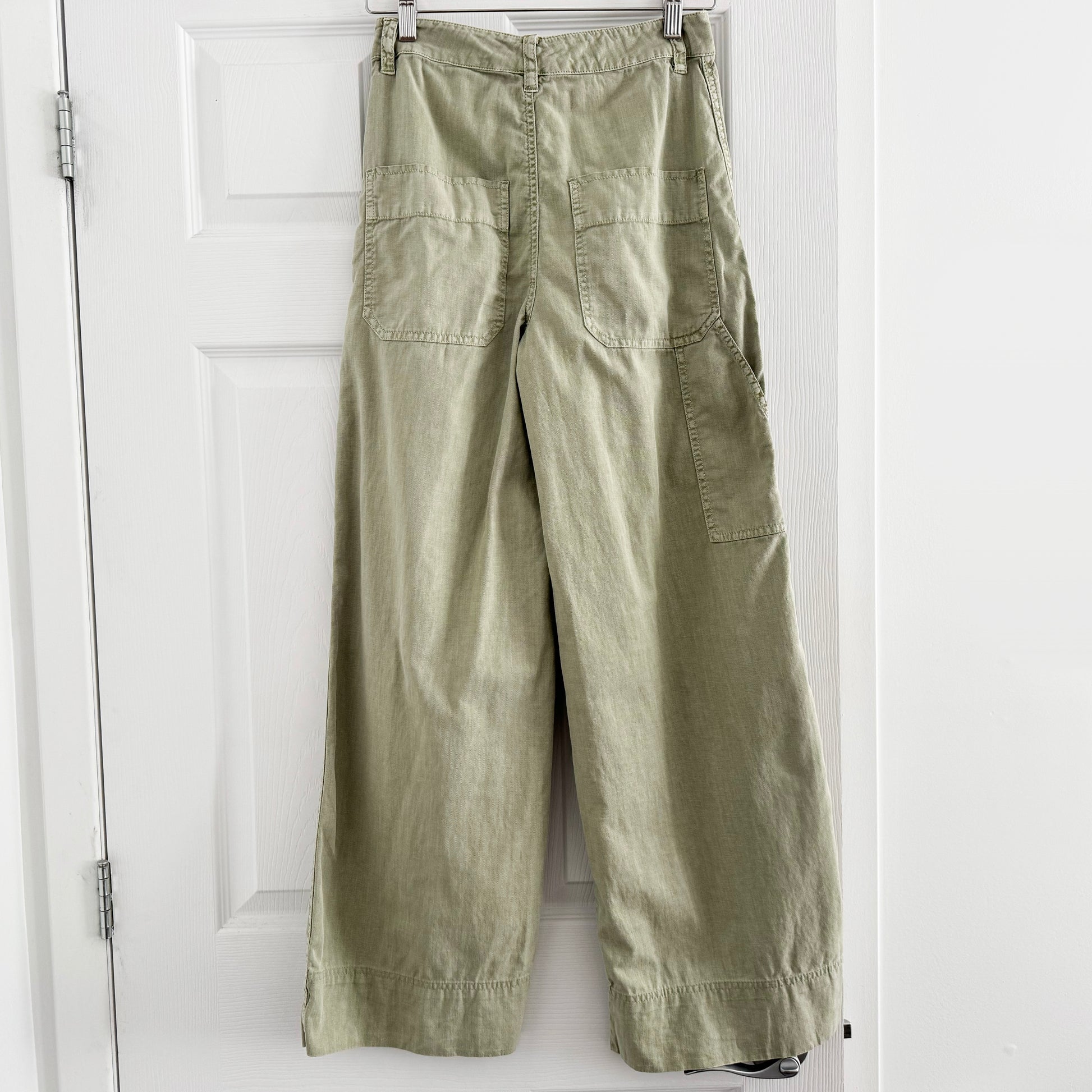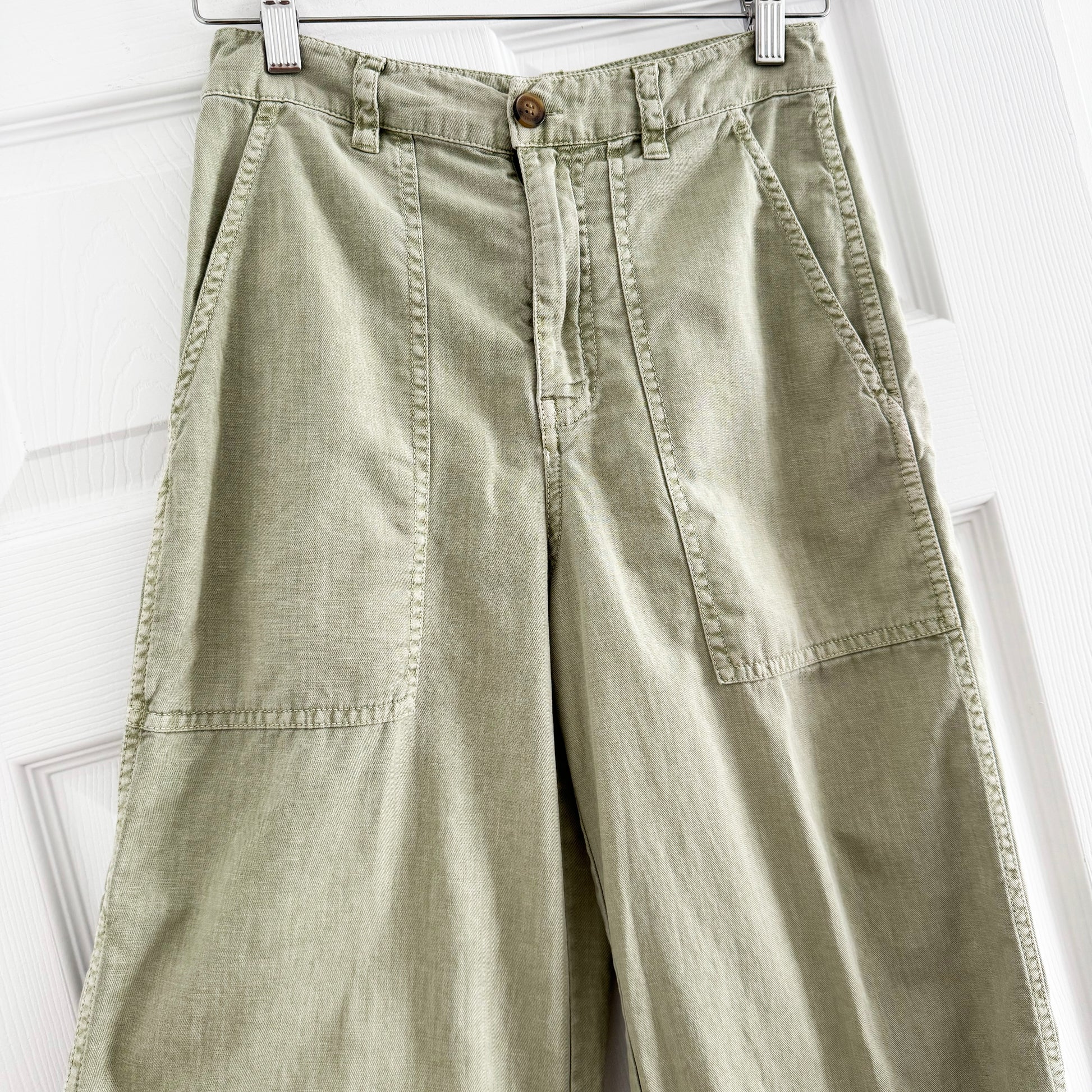 Vanessa Bruno "Carlos" Pant in Green, size 34 (fits like a 24 in jeans). A beautiful casual wear pant for warmer weather! If not - THE PERFECT pant for summer wear - the fabric is so light and luxurious and would be so comfortable no matter what the temperature. Zip fly. The waistband is 13.5 inches, measured flat. 40 inches, total length. 29 inches inseam. These have been hemmed (professionally - very well done - I can't tell just from looking) please check your measurements! 78% Cotton 22% Linen. Worn a few times at most, and in very good condition. Originally $475CAD, and selling here for $135CAD!