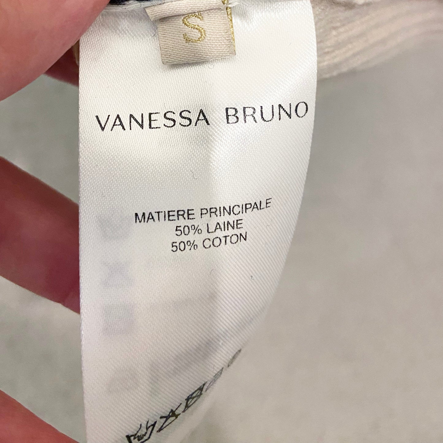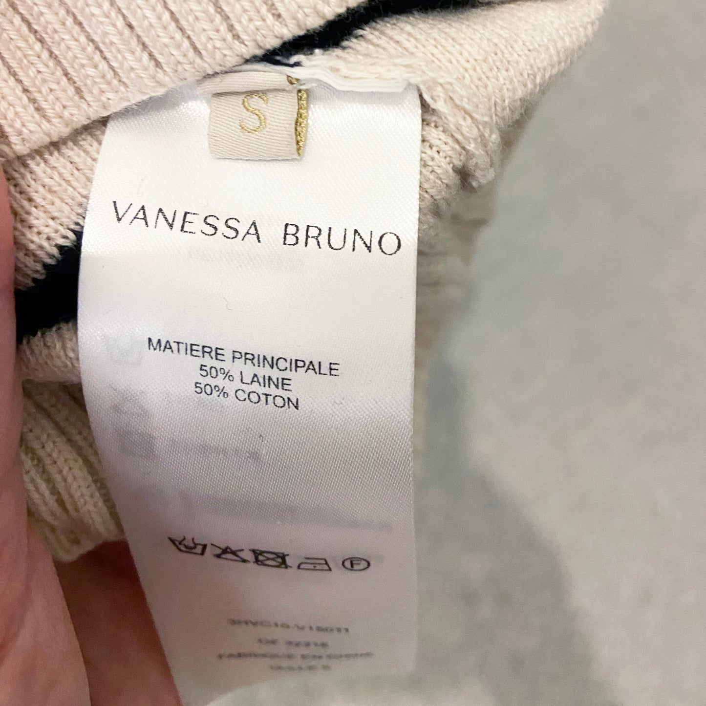 Vanessa Bruno "Cassandra" Knit Top in Navy/Ecru Stripe, size Small. Fits anyone in the XS/S range. This is the smallest size she makes - but it is knit, so it has wiggle room. A stunning transitional wear piece - pairs back to shades from any season, and works perfect with both pants and skirts. 23 inches in length. 15 inches flat at the waistband, unstretched. 50% merino wool, 50% cotton. Never worn. Originally $400CAD, and selling here for $165CAD!