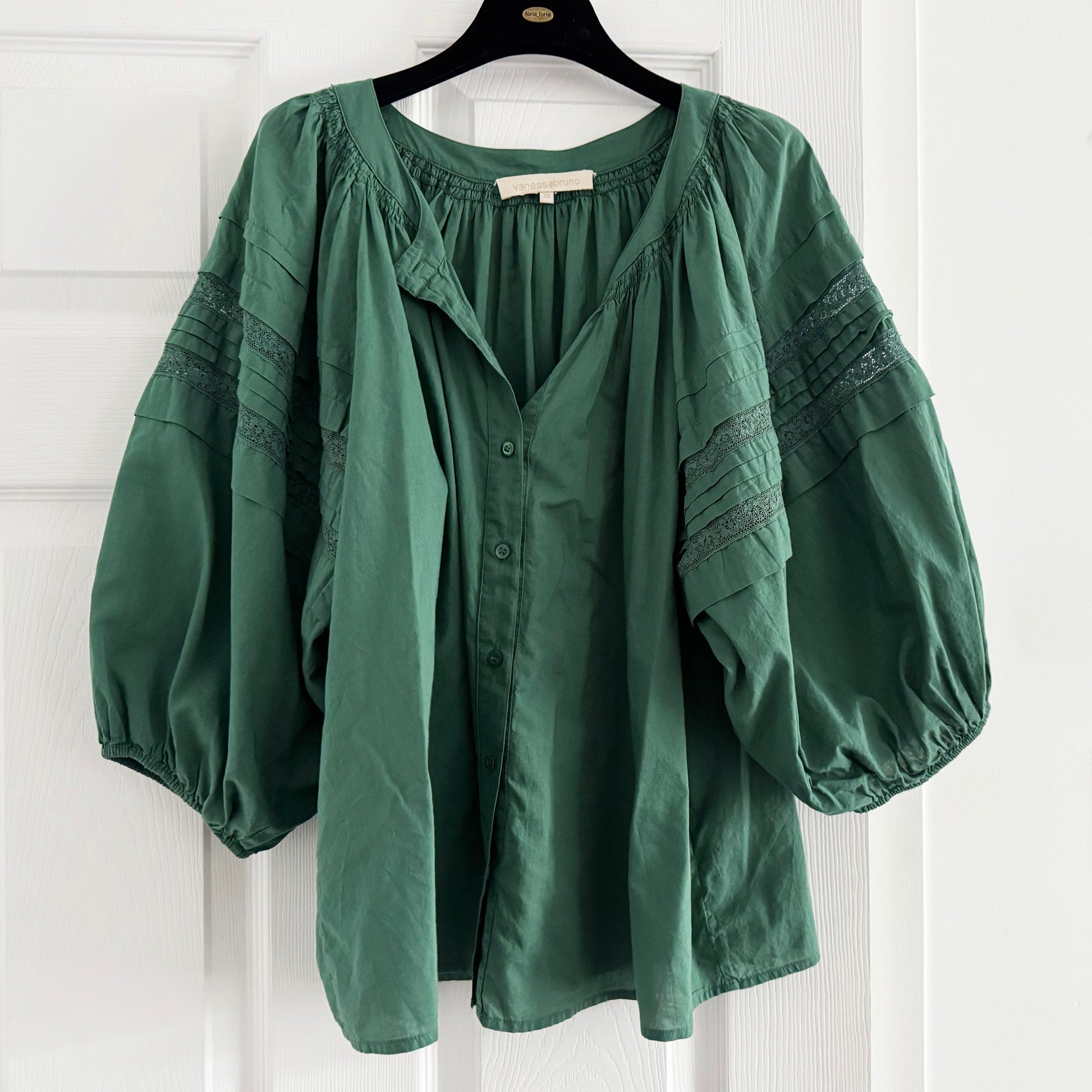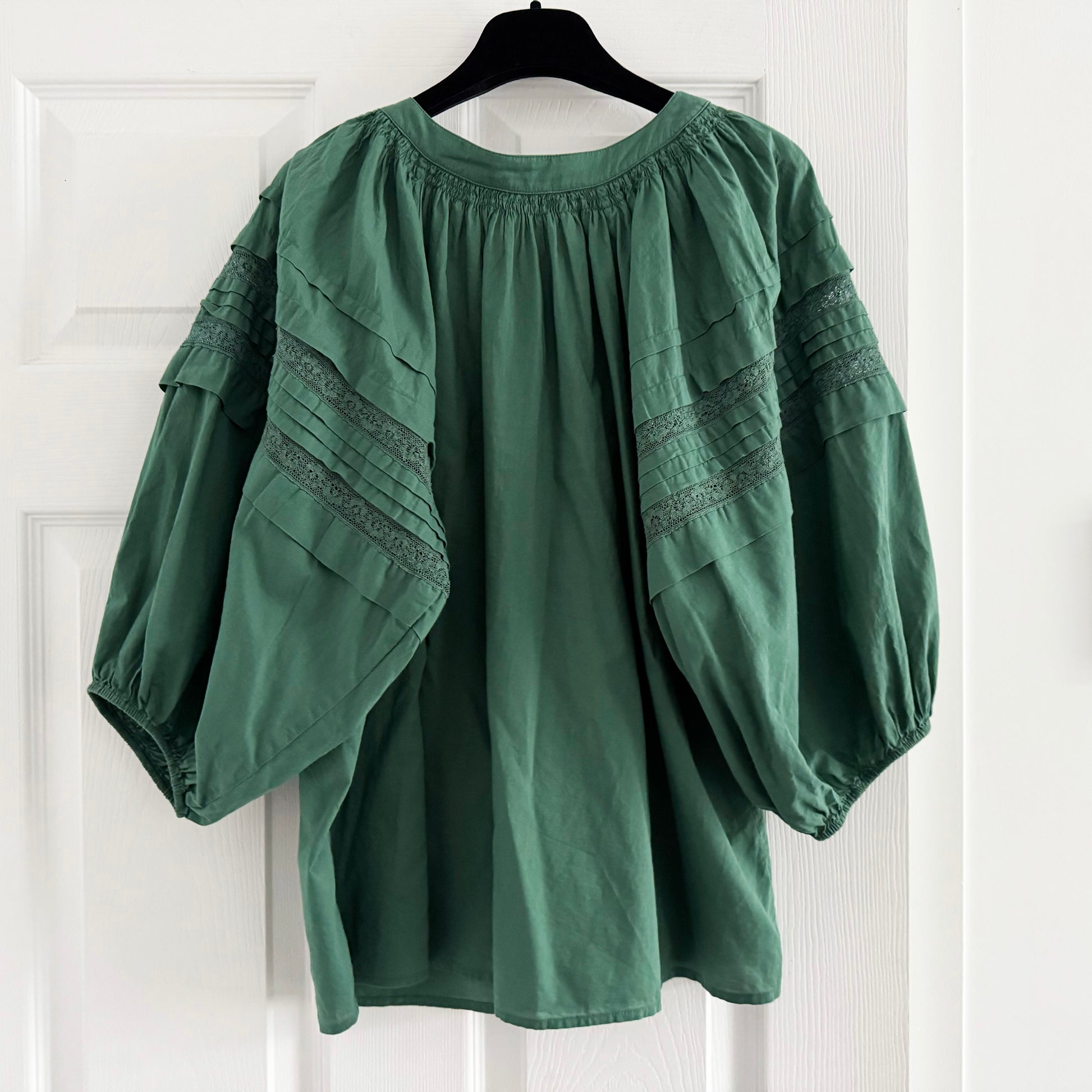 Vanessa Bruno "Tara" Blouse in Green, size 38. Fits like a comfy size Small. Such a beautiful top for summer! The colour! The light fabric! The little details - all of it is so perfect. Pair back to white, black or denim for an easy but cute look. 100% cotton. In excellent condition. Originally around $400CAD, and selling here for $165CAD!