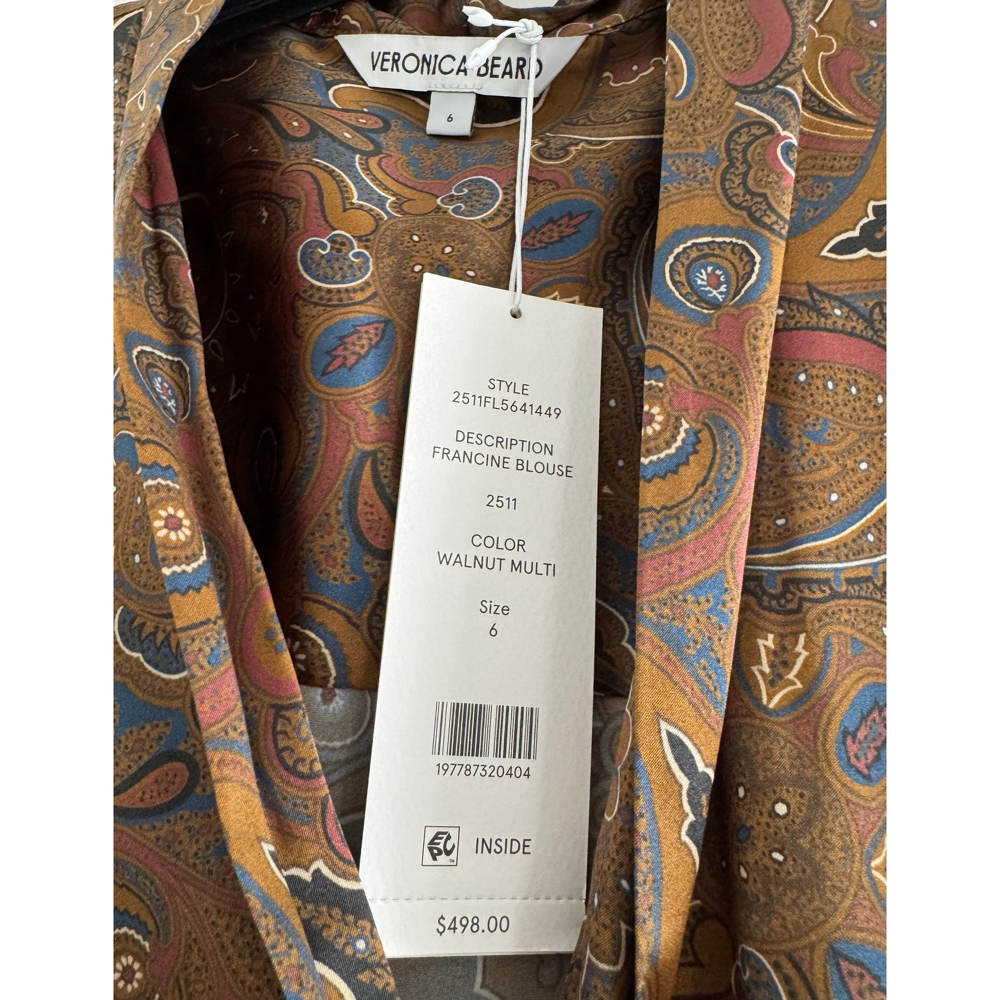 Veronica Beard "Francine" Paisley Stretch Silk Blouse in Brown, size 6. Fits true to size, but could also work for a 4/6. Brand new with tags!