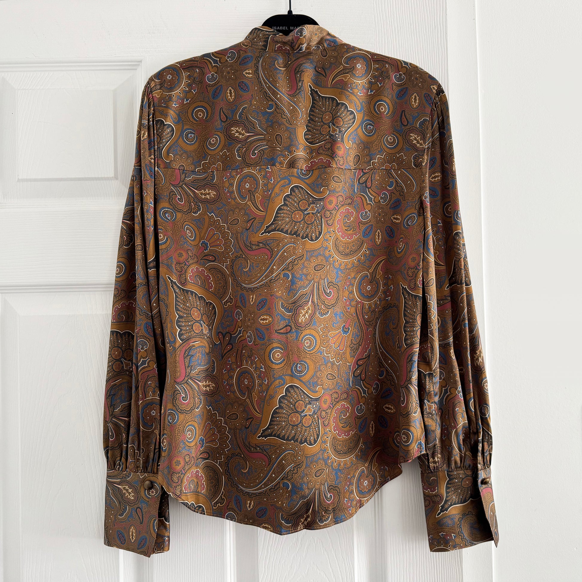 An elegant blouse with desk-to-dinner versatility. Crafted from brown, paisley-printed stretch-silk satin, it's cut for a fluid, relaxed fit and features a deep V-neckline with a dramatic tie-front detail. Wide, buttoned cuffs complete the look. Tuck it into relaxed wide-leg denim or sharp, tailored trousers.