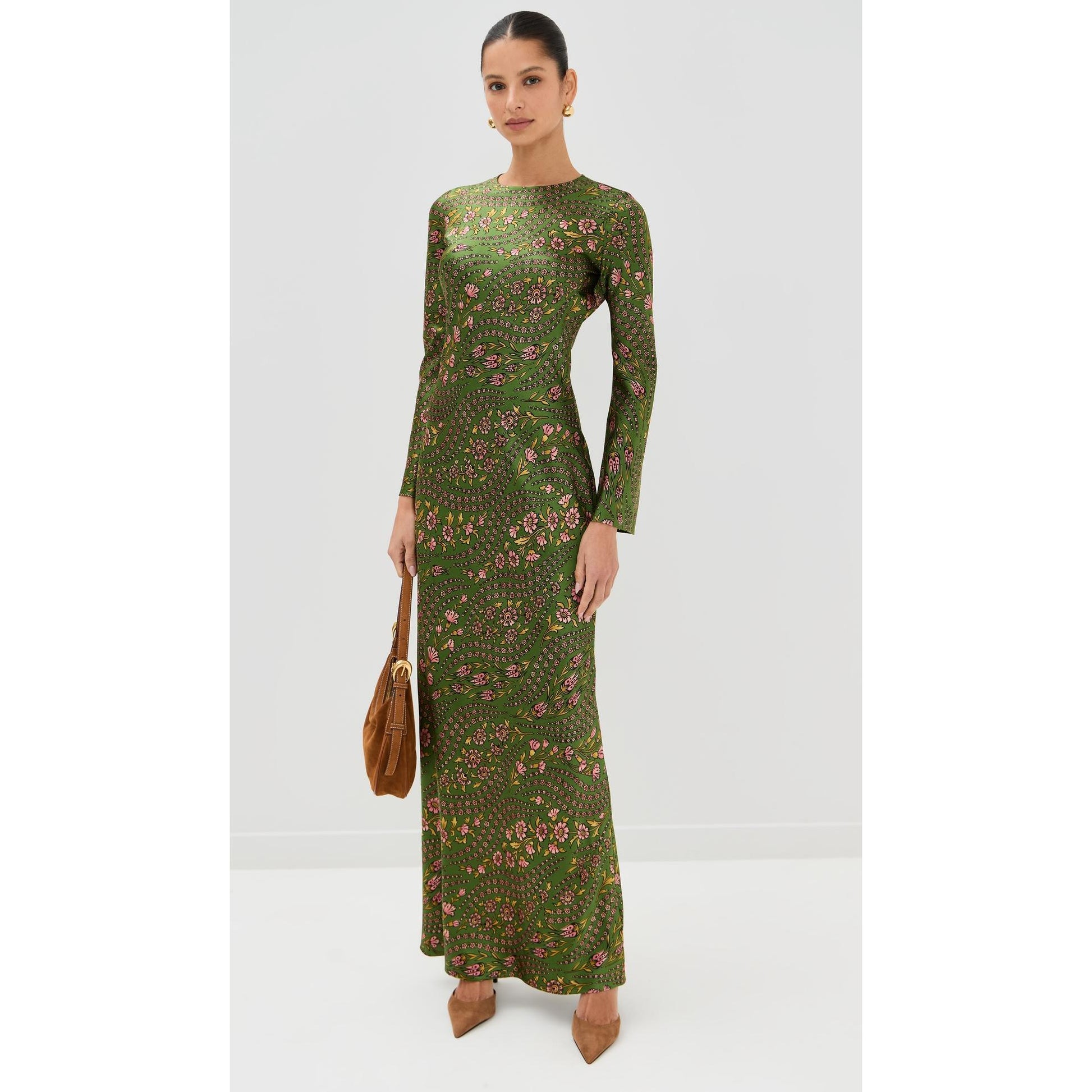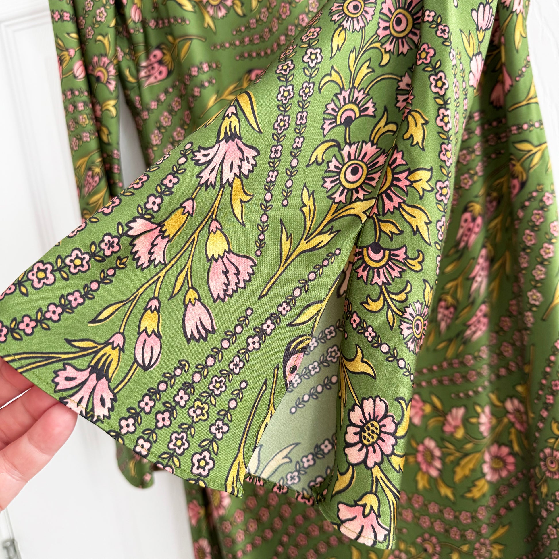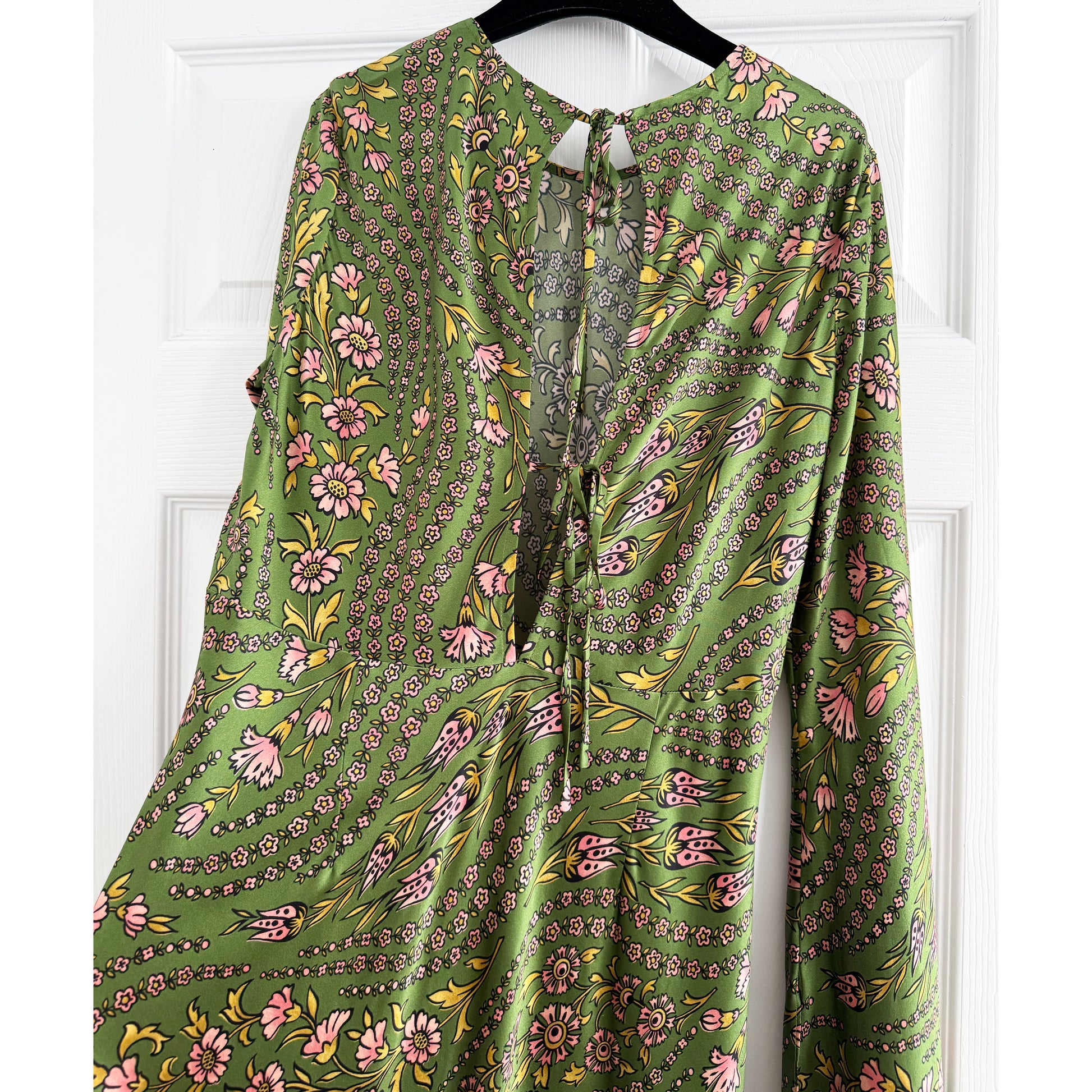 Veronica Beard "Gemma" Floral Silk Long Sleeve Dress in Green, size 6. Fits true to size, but if we’re leaning, maybe a 4/6 since bias cut is always nice loose. Brand new with tags! So chic - with an almost 70's feel, with the flared sleeves, sexy bias cut fit, and lovely small floral print. I love how well this would work for an occasion in any season, from a gala to a garden party. 19 inches armpit to armpit. 64 inches in length. 53% silk, 35% viscose, 12% elastane. Originally $698USD (around $1000CAD), and selling here for $425CAD!