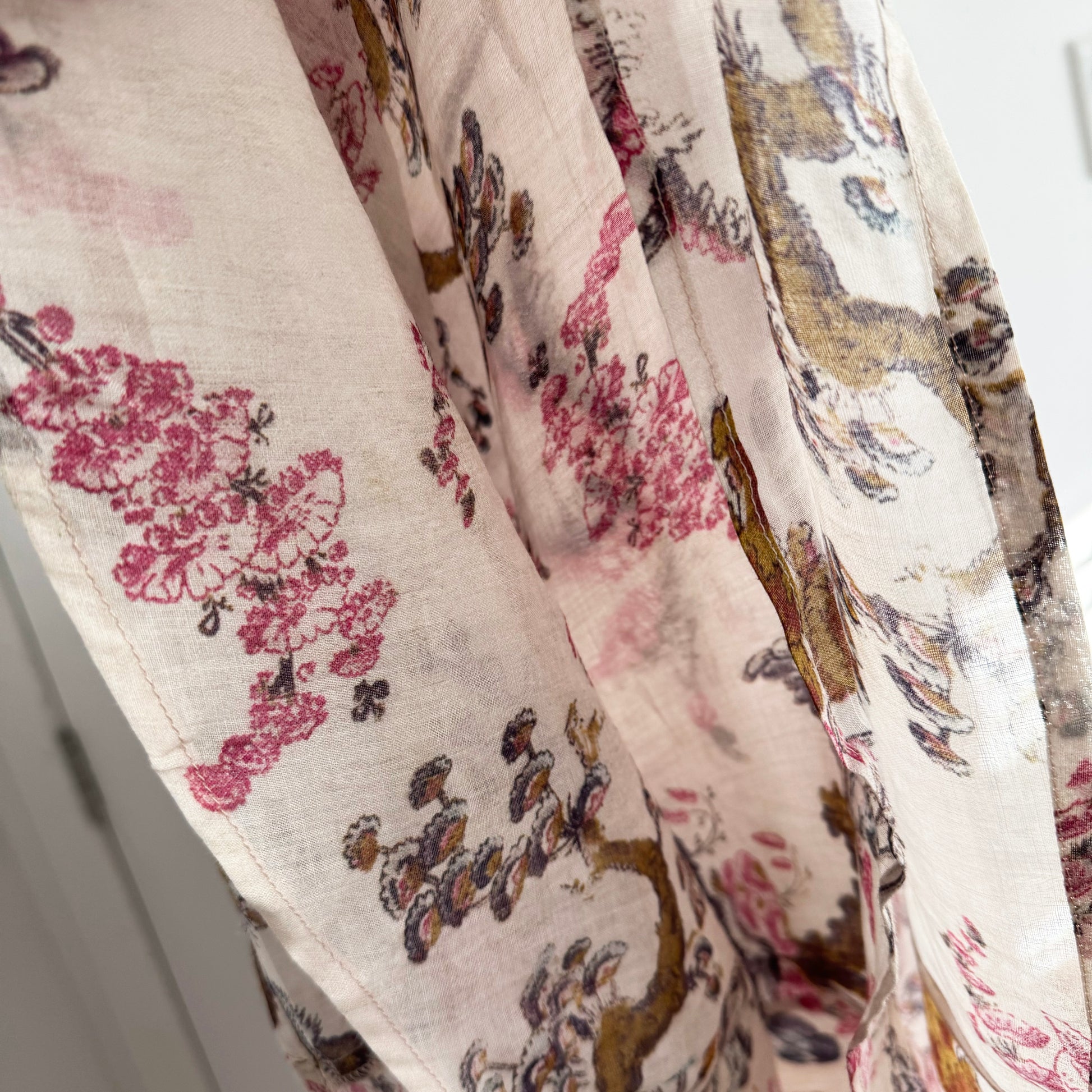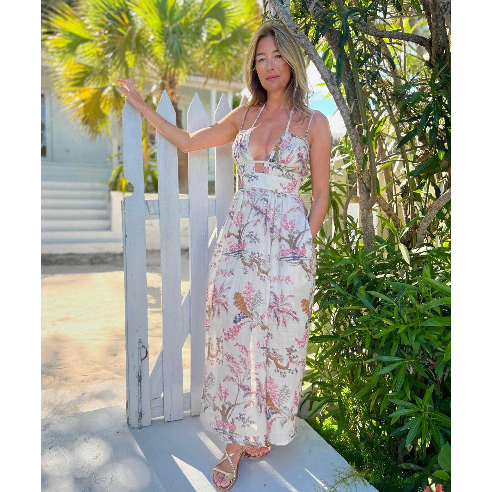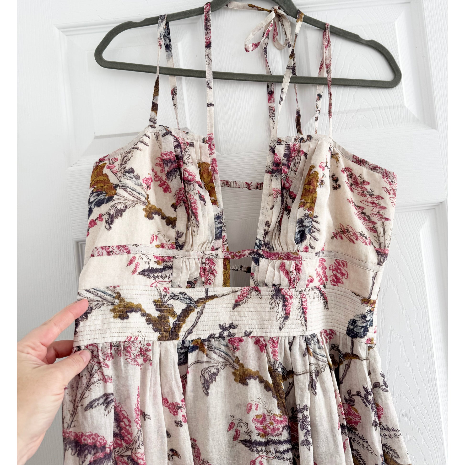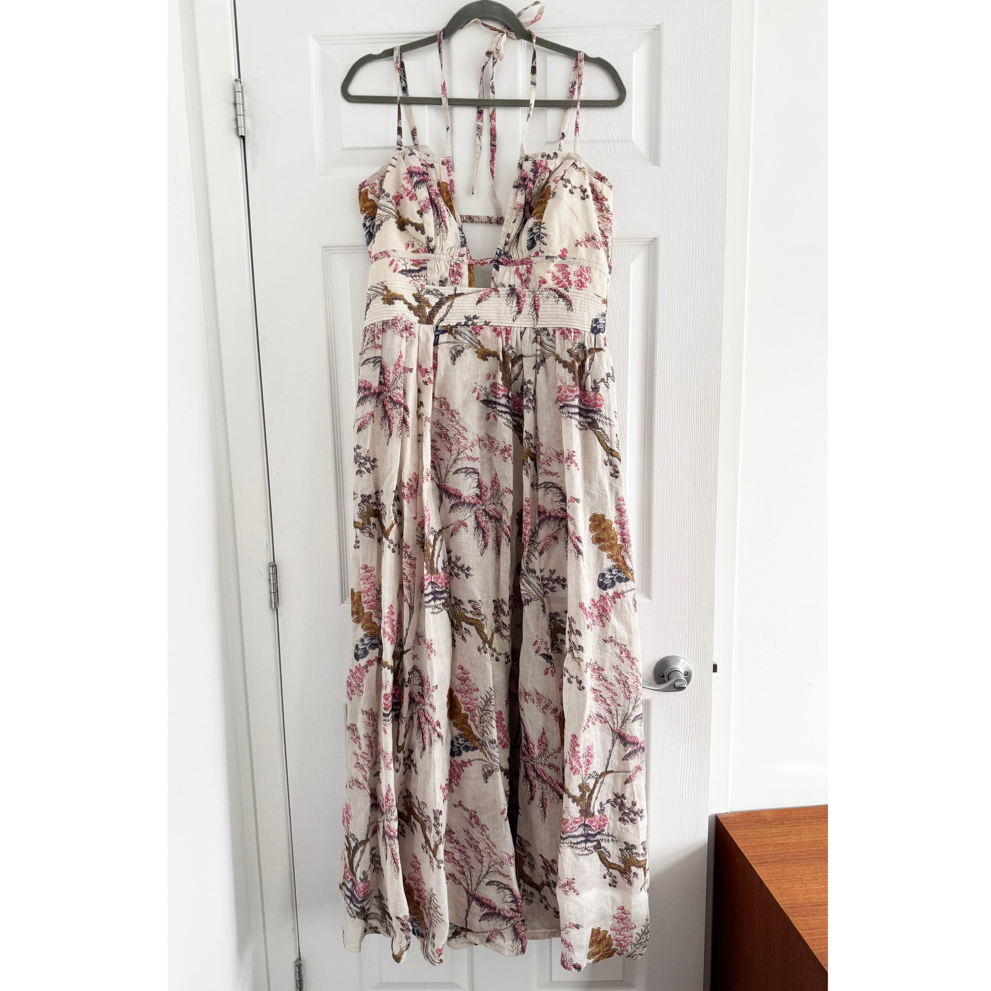 Wiggy Kit "August" Floral Print Dress, size Large. Fits true to size. SOOO beautiful it hurts! The perfect combination of sexy and pretty. It has a defined waist, and offers some support - which is great since you're not wearing a bra with this! It has both regular straps and a tie halter neckline, and elasticated straps across the back. It's done in very lightweight fabric, two layers of fabric in the skirt keep it from being see through. 32 inches waistband (little elastic panel at the back of the waist for some give). 40 inches from the bottom of the waistband to the hem. 100% linen. In excellent condition - no signs of wear. Originally around $950CAD, and selling here for $345CAD!