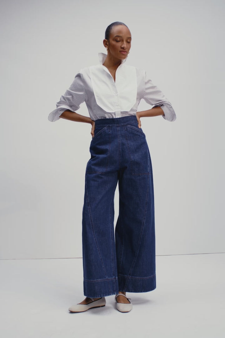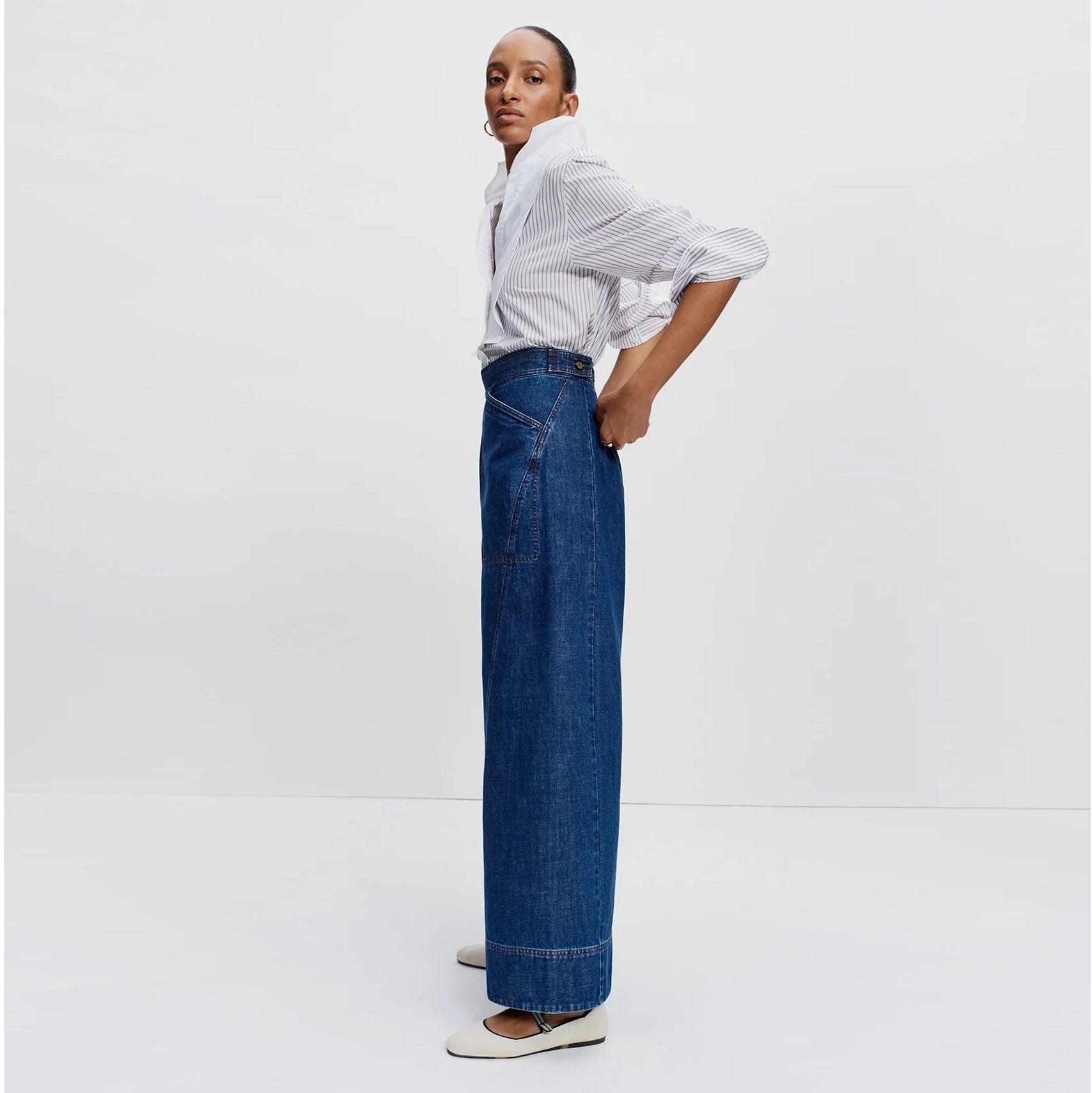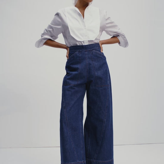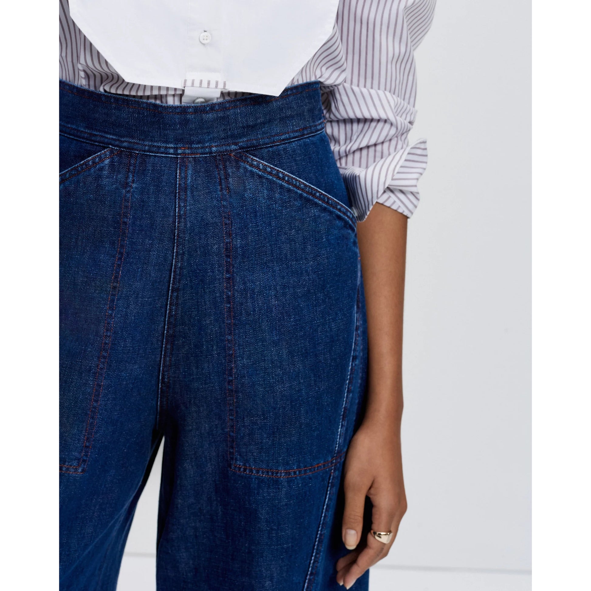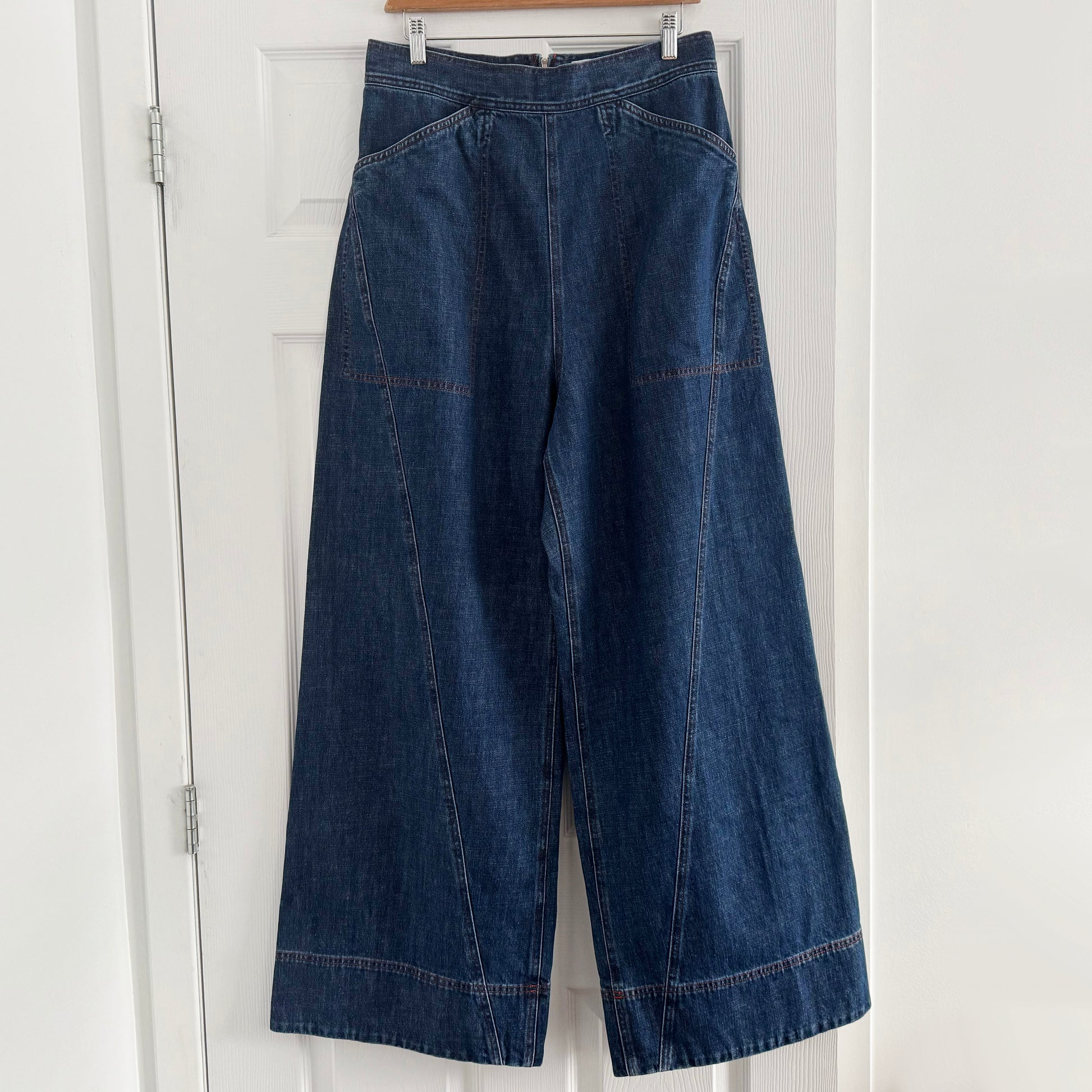 Wiggy Kit "Forward Seam" in Blue, size Large (fits like Medium). Brand new with tags! High waisted for that long legs vibe, and a wide leg cut for a silhouette that's both dramatic and flattering. These feature a forward seam that wraps around the leg, that from the side looks really cool. Slant pockets at the hip and a clean back makes for an unconventional twist from a regular jean. The zip closure is on the back centre seam! Also very unusual for jeans! 31 inches actual waistband. 15 inch rise. 30 inch inseam. 100% cotton. Currently retails online for $630CAD, and selling here for $275CAD!