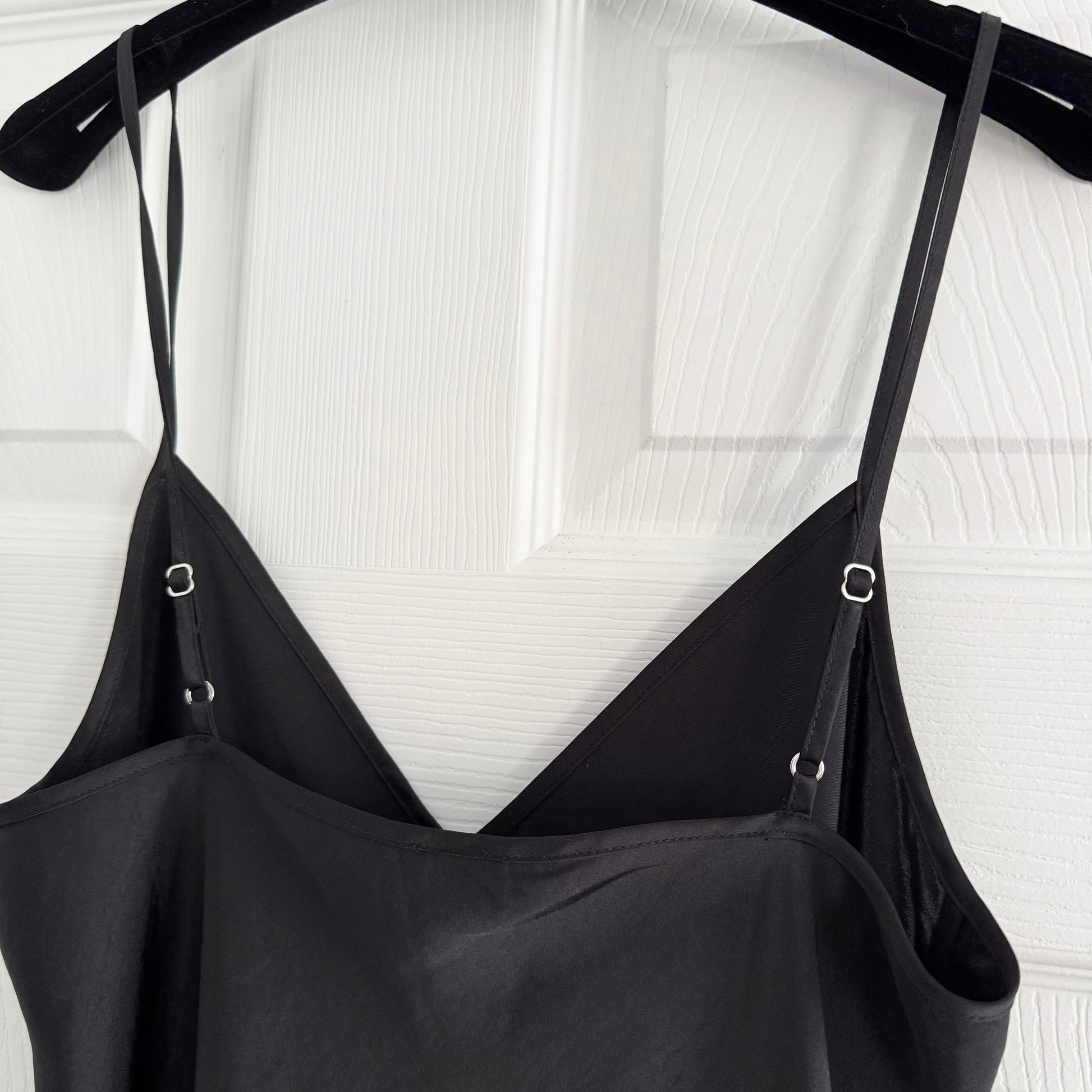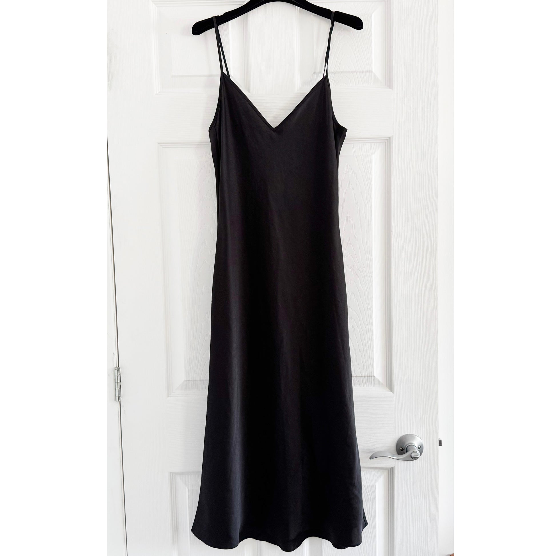 ilfred Only Slip Satin Midi Dress in Black, size Small. Fits true to size. A handy wardrobe staple, whether you're layering it or wearing it solo - great if you don't want to invest heavily in a silk one - or prefer the durability and ease of care of polyester - whip it out of the suitcase and it's ready to wear as is! 17 inches armpit to armpit. 38 inches in length measured on the side seam - so where hits on your leg depends on how much you've shortened or lengthened the strap. 100% polyester. In excellent condition. Adjustable shoulder straps, and some flexibility in fit through the hips. Originally $118CAD, and selling here for $45CAD!
